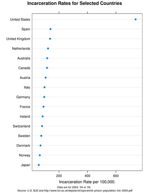 Every time I hear or read about a numerical fact, I always ask myself “is this high, low, average” for this particular phenomenon. In order to answer this question, I’m required to make at least an implicit comparison. So when I read today that for the first time ever, 1 in 100 American adults is incarcerated, I wondered how that compared to other countries. The information is not hard to find. Here’s a chart for your perusal. What do you think accounts for the variation in incarceration rates across countries?