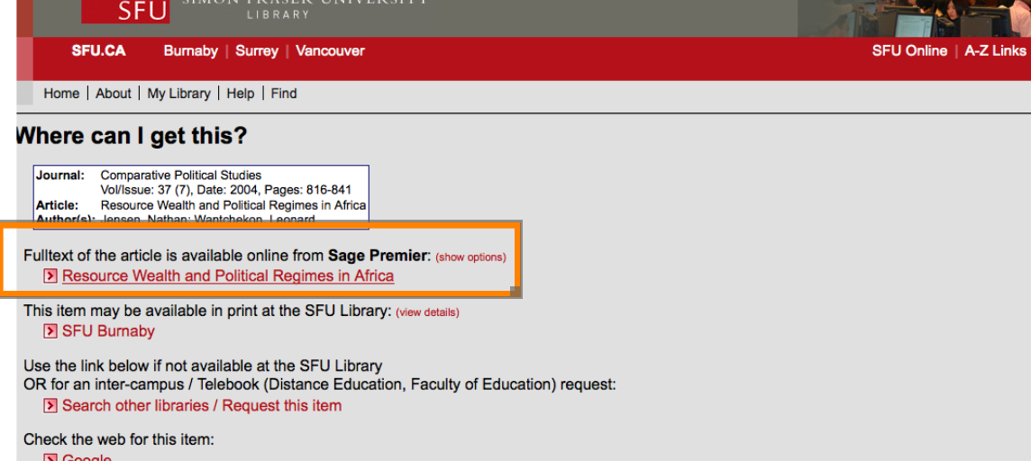 4) A new browser window will open, leading to information on how you can access the article–both online and via other methods. Click on the appropriate online link. In this case, it’s the Sage electronic journals link.