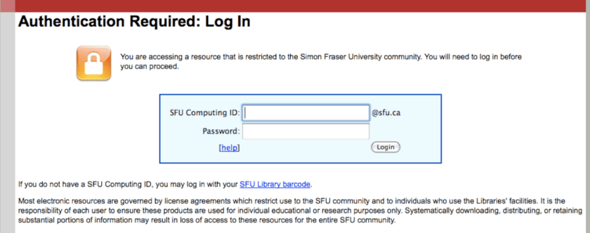5) Clicking on the appropriate link will cause the library to re-direct you to the SFU authorization page, where you will be required to enter you netid and password, and press “Login.” This will redirect you to a PDF version of the paper.