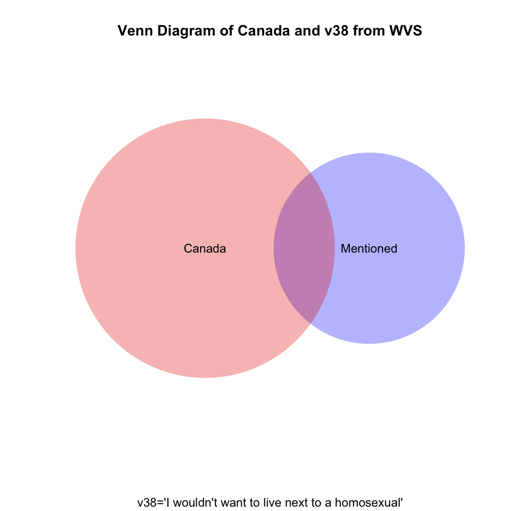 Just eyeballing the venn diagram we can be sure that the proportion of homophobic Canadians is larger than 3.9%. What we need is the proportion of Canadian respondents only(!) who mentioned homosexuals in v38. The code for that is: