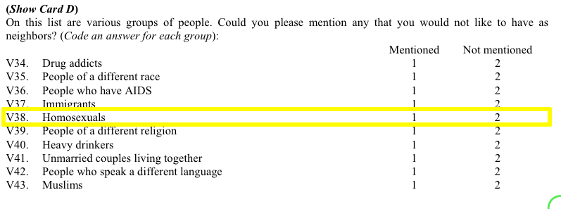 More than a handful of you used the code below to try and determine how the respondents in each country answered question v38. First, here is a screenshot from the WVS codebook: