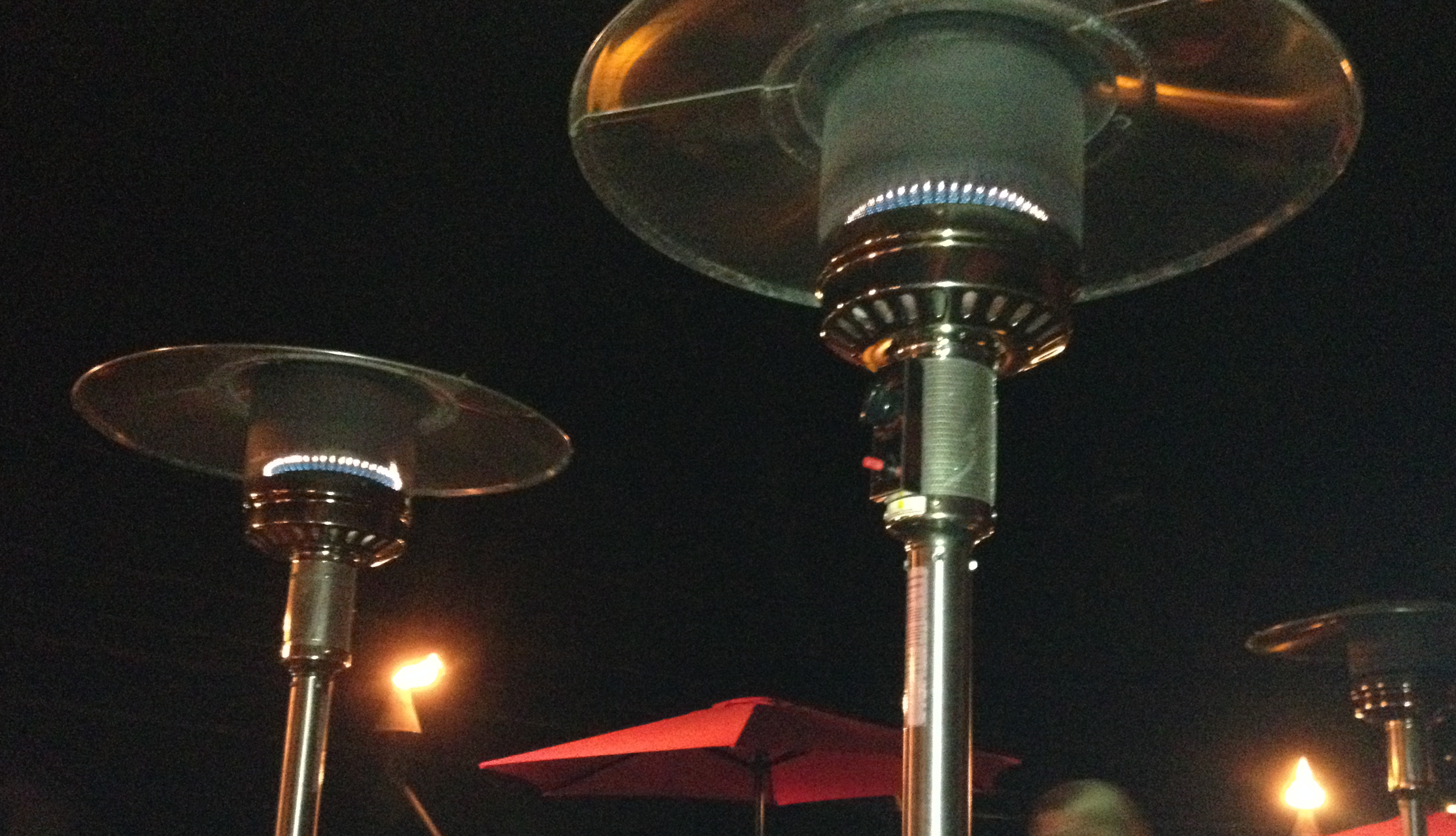 The patio heaters below were in use for about 6 hours each that evening, and I counted 20 in total. Does anybody know how many bowls of rice could have been cooked instead with that energy?