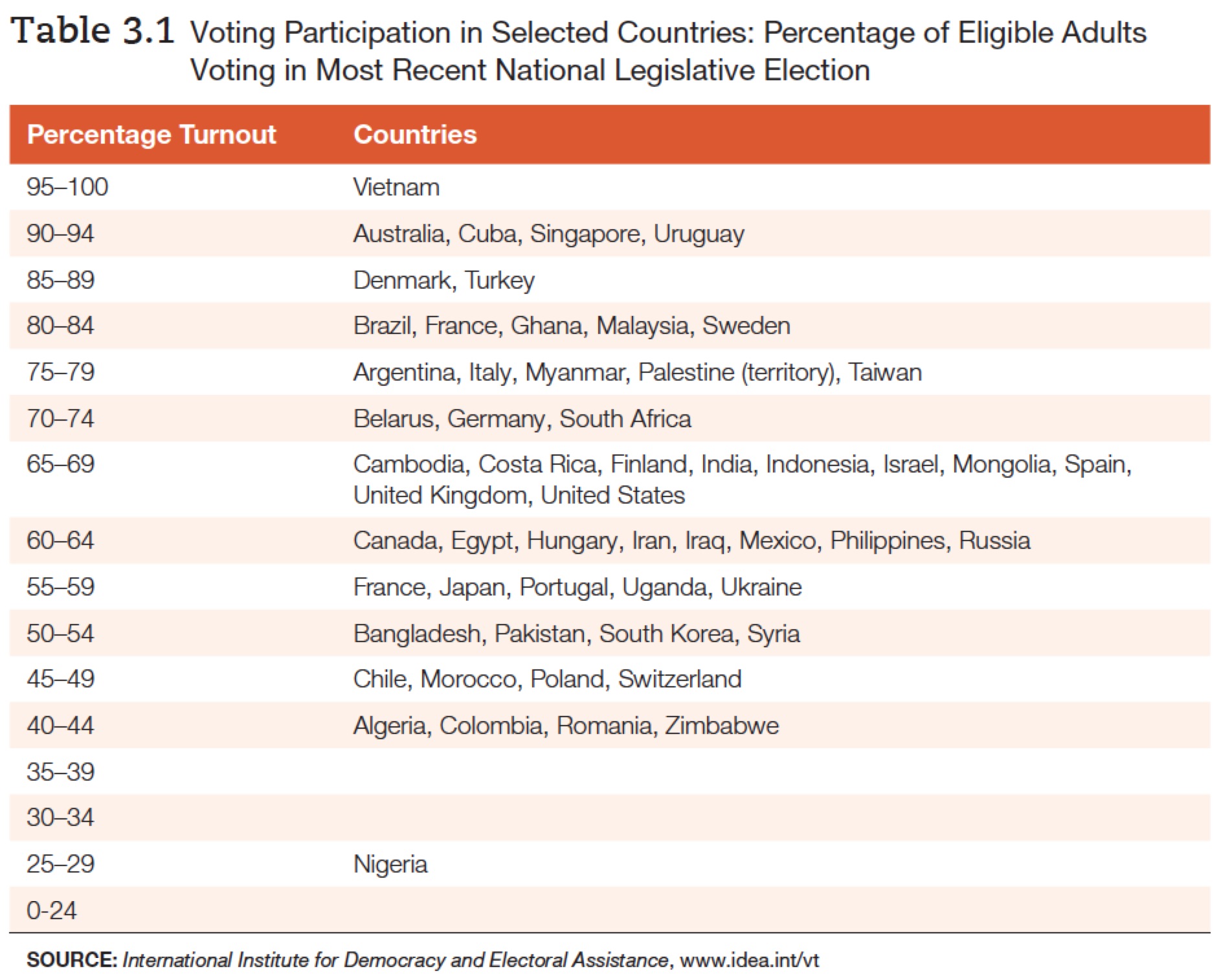So, let’s look at Canada and Australia–two countries that are quite similar in many respects: former British colonies, large land masses with relatively small populations, multi-cultural, constitutional monarchies, parliamentary democracies, economies reliant on natural resources, neither of which has won FIFA’s World Cup (men or women), etc. The two countries, differ, however, in levels of voting participation. Whereas barely 60% of eligible Canadians vote in federal elections, the corresponding figure for Australia is well over 90%. Do Aussies simply value political participation more than Canadians? Hardly! Australia has a mandatory voting law, which penalizes (monetarily) those who do not vote.