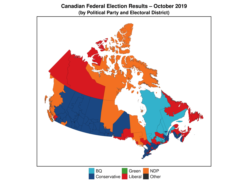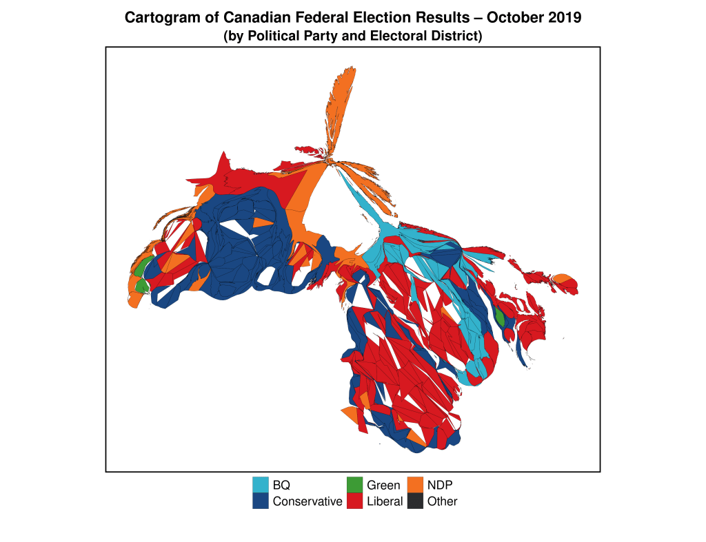 We can use treemaps to more “accurately” depict electoral outcomes. By accurately, I mean that the visual representation of the data more closely reflects how many voted for each candidate (party).