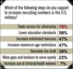 Many proposals have been suggested to help the military meet its recruiting and retention needs. But an incredible percentage of the index’s officers favor the same solution: Nearly 80 percent support expanding options for legal, foreign permanent residents of the United States to serve in exchange for U.S. citizenship. A high percentage of officers, about 6 in 10, also support the idea of allowing more recruits who have a high school equivalency degree—but no diploma—to serve. Almost 40 percent favor reinstating the draft.