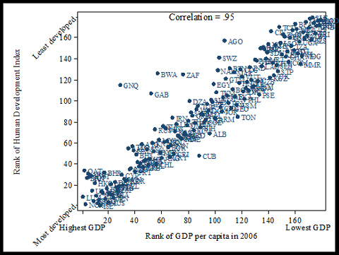 What I most likely said was that there was a very high correlation between a country’s GDP and is score on the Human Development Index (HDI). Just a bit of research…turns up this interesting bit of analysis by Justin Wolfers at the NY Times Freakonomics blog, showing a correlation of 0.95 between a country’s HDI rank and GDP rank (2006). That’s an exceptionally high correlation, suggesting that the HDI isn’t measuring much more than the country’s level of GDP.